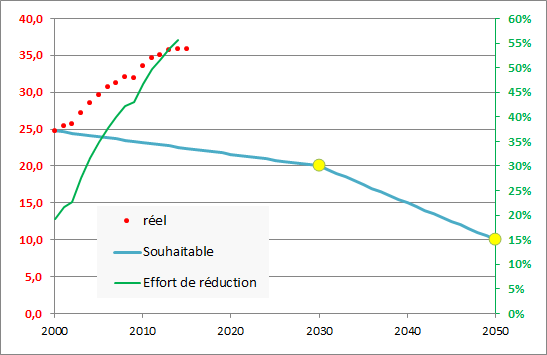 En 2000, nous étions à 25GT, on avait à la fois 25 ans pour réduire de 15GT et un crédit de 1000GT. En terme d'effort, pour simplifier j'ai chiffré cela à 20%. Le calcul est en fait complexe car l'effort est-il constant/linéaire ? en réduction de % ou en tonnes de CO2 ? Voir pas linéaire, et dans ce cas, plus d'efforts au début ou à la fin au fur et à mesure que l'on progresse technologiquement ?.